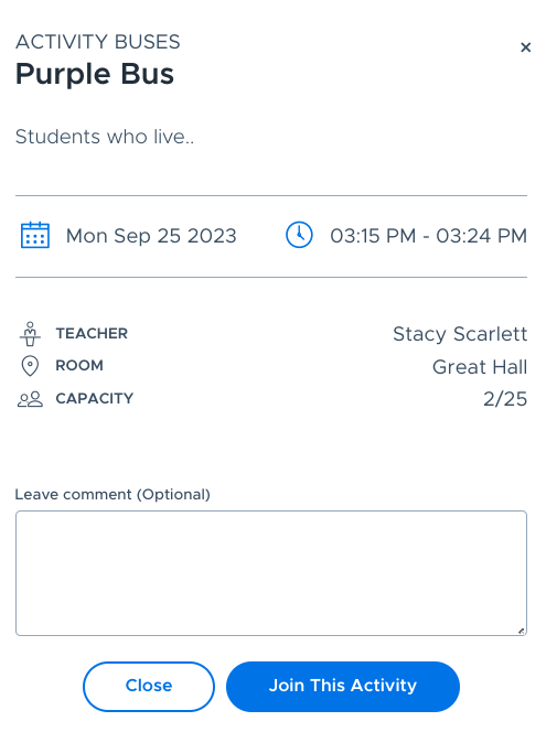 If you look on Flex and go to the purple, blue and green activity buses, in the description of the event you see this:
